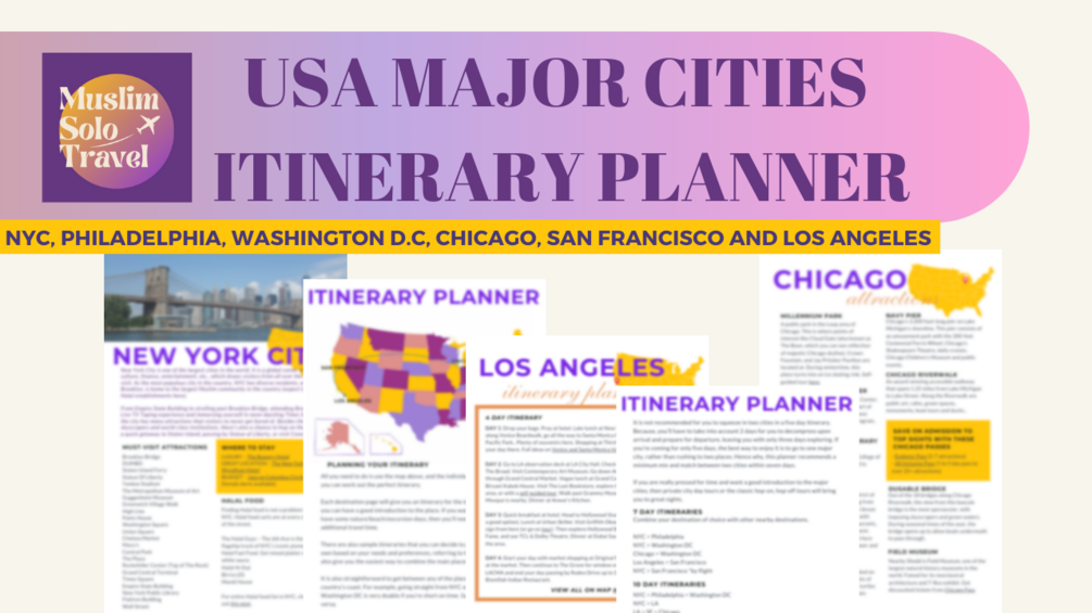 - 27+ pages of COMPREHENSIVE ITINERARY PLANNER 📒 covering SIX (6) Major USA 🇺🇸 cities of New York City, Philadelphia, Washington D.C, Chicago, San Francisco, and Los Angeles & practicalities and advice on traveling solo as a Muslim.